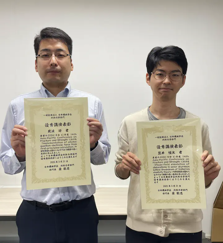 優秀講演表彰受賞! 9月 4, 2025 見波先生,笠井さん(D3)が14th Asia-Pascific Conference on Fracture and Strengthにおいて優秀講演表彰を受賞しました. おめでとうございます! 材料物性学研究室 京都大学 大学院工学研究科 機械理工学専攻